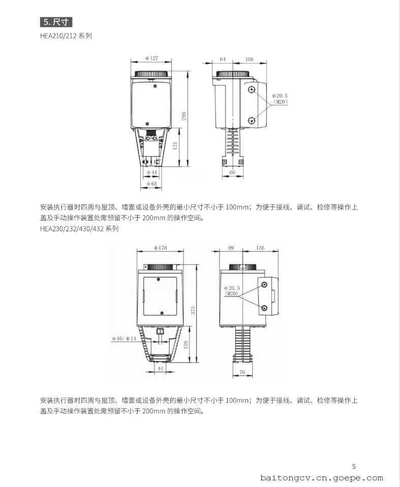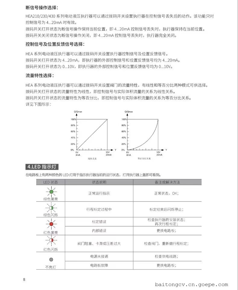 工作环境温度:-15...70℃;电源条件: AC24V±20% 50/60Hz;防护等级:IP54;回差:≤ 1%;控制信号:DC0...10V,4...20mA 或 0...1000Ω 可设置;位置反馈:DC0...10V,4...20mA 可设置;定位力:1000N,2800N(5000 至 25000N 定位力执行器正在开发中);行程:20mm,40mm(60 至 100mm 行程执行器正在开发中);流量特性:线性或等百分比可设置;弹簧复位:可选带或不带弹簧复位功能;运行方向:HEA210/230/430 均可设置运行方向;断信号动作:控制信号为 4...20mA 时 HEA210/230/430 可设置保持当前位置或恢复关闭状态;校准:自带校准功能,可方便快速的对执行器或阀门总成校准;状态显示:自带 LED 指示灯显示执行器运行状态;手动控制:带手动操作机构及状态指示。